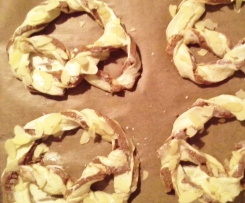 Habe die "Brezeln" gestern gemacht, schmecken super - Einzig habe ich keine Brezeln geformt, sondern Stangen. Habe die Streifen einfach doppelt gelegt und gezwirbelt.... Total lecker, gibt es öfters