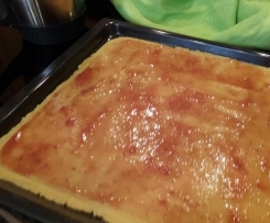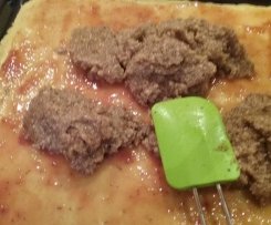 Den Teig dünn mit Marmelade bestreichen, besonders geeignet ist Aprikose, aber Versuche mit anderen Sorten sind bisher immer auch sehr gut gelungen.