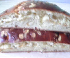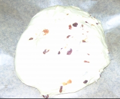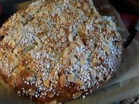 Habe aus der Teigmenge auch 2 Fladen gemacht. Einmal Rosinen und einmal gehackte Mandeln untergehoben.