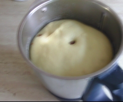 3 Min/ Knetstufe zu einem Teig verarbeiten.Sie Rosinen werden in den letzten 30 Sekunden durch die Deckelöffnung dazu gegeben.Anschließend den Teig 30 Min. im Topf gehen lassen.