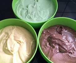 Kuchenform einfetten und die Teige nacheinander (Kakao zuerst, dann Vanille danach Waldmeister) einfüllen.