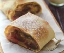9. Oberflächen der Strudel mit der restlichen geschmolznen Butter bestreichen, 25-30 Minuten (230°C) backen, jeden Sturdel in 6 Scheiben schneiden und lauwarm servieren.