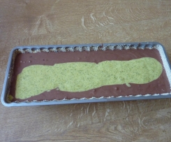 Nun den dunklen Teig in eine Kasten- oder Rehrückenform füllen, anschließend die Pistazienmasse aus der Schüssel der Länge nach auf den Teig fließen lassen: siehe Bild.