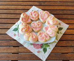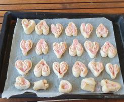 -Wer mag kann 1 Blech direkt backen und das andere Blech mit den Herzen abgedeckt in den Kühlschrank geben und am nächsten Tag Blech aus dem Kühlschrank nehmen, 15-20 Min. bei Raumtemperatur gehen lassen anschließend in den kalten Backofen schieben und bei 180°C ca. 20 Min. backen, so hat man am nächten Tag frische Herzen.