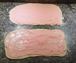 Den aufgegangenen Hefeteig auf eine bemehlte Arbeitsfläche geben, in 2 gleichgroße Stücke teilen. Jedes Teigstück zu einem Rechteck von ca. 20x40 cm ausrollen (wer den Teig nicht so dünn möchte rollt in 20x30cm aus) und je mit der Hälfte des Puddings bestreichen.