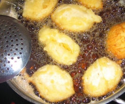 Je nach Topf, 5 - 7 Nocken (nicht zu viele Nocken, sie müssen sich noch drehen können) zusammen frittieren. Gegebenenfalls beim drehen mit einem Löffel etwas nachhelfen. Nach ca. 7 Min. wenn die Quarkspitzen von beiden Seiten schön braun sind, eine heraus nehmen, auseinander machen und prüfen ob der Kern auch durch ist.