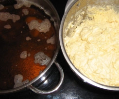 Mit einem Esslöffel (kurz ins Fett tauchen) Nocken aus dem Teig stechen (müssen nicht gleich groß sein) und ins Fett geben. Bitte Löffel wenig übers Fett halten, sonst sprizt es, evtl. 2. Löffel nehmen zum Lösen der Nocken vom Löffel.