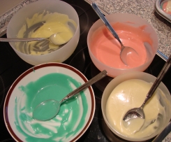Jede Schüssel mit einem kleinen Schneebesen zu dem gewünschten Farbton verrühren.