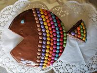 Den Zebrakuchen mit den bunten Schokolinsen zum Regenbogenfisch dekorieren.