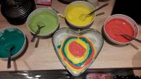 - fügen Sie nun pro Schüssel eine Farbpulvertüte hinzu und verrühren Sie diese ordentlich mit einem kleinem Löffel - - Nun mit der ersten Teigmischung (z.B. gelb) 2 EL in die MITTE der vorbereiteten Springform geben