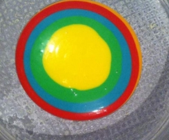 9. In die Mitte der Spring form gebt ihr einen Kleks (EL) gelben Teig, in die Mitte des gelben Kleks gebt ihr einen EL vom roten Teig, in die Mitte vom roten Kleks gebt ihr einen EL vom blauen Teig, in die Mitte vom blauen Teig gebt ihr einen EL vom grünem Teig, ... und immer so weiter, bis der Teig komplett aufgebraucht ist.