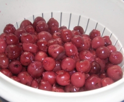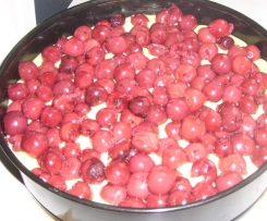 Dann die Kirschen abtropfen lassen und auf dem Kuchen verteilen .