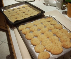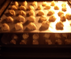 Dann alle anderen Zutaten in den Mixtopf geschlossen"Mixtopf geschlossen" geben und bei ca .4 - 5 Min ./  Modus „Teig kneten“" Modus „Teig kneten“" --den Teig mit einem teelöffelweise als Kugeln mit großem Abstand auf ein gefettetes    ---- 3  Stük Backblech setzen .