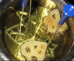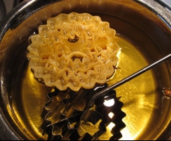 Dann das Eisen ins heiße Fett halten und mit einem kleinen Ruck harausheben. Wenn's nicht gleich geht, bissle ruckeln und an den Topfrand klopfen. Der Teig bleibt im Fett und wird goldbraun ausgebacken.