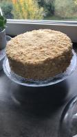 Die Teigschichten mit der Creme beschmieren. Erst die Creme, dann Teischicht, dann die Creme, nächste Teigschicht..etc. bis die Torte zusammengebaut ist. Die Torte anschließend mit der "Panade" belegen.