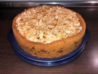- Sahne ggf. mit Hilfe eines Tortenrings auf dem kalten Kuchen verteilen, die kalten Mandelblättchen oben drauf streuen und bis zum Ssrvieren kalt stellen.