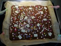 In noch weichem Zustand die Schokoladenoberfläche dekorieren mit z.B. kleinen Butterkeksen, Smarties, Krokant, gehackten Mandeln oder mit dem, was Ihr gerne mögt.
