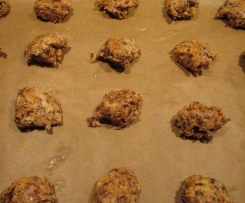 Mit zwei Teelöffeln walnussgroße Teighäufchen auf einem mit Backpapier ausgelegtes Backblech setzen (die Löffel zwischendurch in kaltes Wasser tauchen, da der Teig sehr klebrig ist) und die Plätzchen bei 180°C, Ober-/Unterhitze, auf der mittleren Schiene ca. 15 Minuten backen.