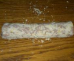 "Mixtopf geschlossen" geben und in 20 sec Stufe 6 zu einem glatten Teig verarbeiten.Teig in vier gleich große Portionen teilen und jeweils zu Rollen mit ca. 2,5 cm Durchmesser formen. Die Teigrollen in den gehackten Pinienkernen wälzen
