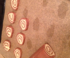 Aus hellem und dunklen Teig gleichmäßige, lange und schmale 2-3 mm dicke Platten ausrollen. Die eine Platte mit Wasser bepinseln, die andere darüberlegen und leicht festdrücken. Die Oberseite der so erhaltenen Platte wieder mit Wasser bepinseln und dann fest einrollen.