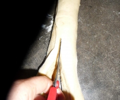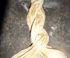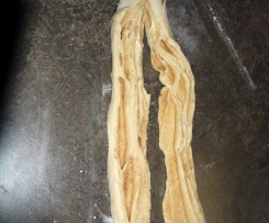 Teig von der langen Seite her aufrollen und in der Mitte entlang aufschneiden. Aber den Anfang nicht durchschneiden.