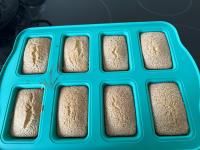 Ich habe den Teig in eine Silikonform für 8 kleine Kuchen oder Brote für 25 Minuten bei 175 Grad O/U gebacken. Ich hatte allerdings 8 Eigelb, 135g Butter und 160g Mehl. Zucker habe ich so gelassen, könnte nächstes Mal weniger sein. Die Kuchen erinnern mich an die spanischen Eierküchlein. Hat auf jeden Fall alles funktioniert und wir mochten sie.