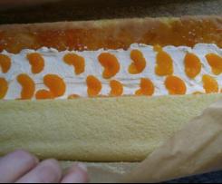 ) - die Seiten der Backfolie zuletzt etwas nach innen schlagen, damit die Biskuitrolle nicht austrocknet und die Rolle komplett abkühlen lassen. Ich backe die Rolle meist am Abend, lasse sie so über Nacht auskühlen und fülle sie erst am nächsten Tag. - Mandarinen (bzw. Mandarinorangen, wie's auf den Dosen steht) abtropfen lassen und je nach Belieben 5-15 besonders schöne Exemplare für die Außendeko zur Seite legen.