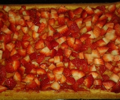Für den Belag erstma das Päckchen Gelatine nach Packungsanleitung anrühren und aufquellen lassen. Währendessen wird der Joghurt in eine Schüssel gefüllt und die Erdbeeren können schon mal gewaschen und klein geschnitten werden. Dann wird die Gelatine erwärmt bis sie sich aufgelöst hat, danach ca. 3 EL Joghurt in die Gelatine mit verrühren un zu guter letzt die GelatineMix in den Joghurt mischen. Und nu die 200 g Sahne steif schlagen und unter die Joghurtmasse heben.