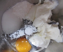 Quark, Eigelb, Zucker und Vanillepuddingpulver in den