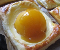 .... und eine Pfirsichhälfte daraufsetzen. Das Ei verquirlen, die Ränder damit bestreichen (man benötigt leider nicht die ganze Eimasse...). Die Teigränder rundherum etwas hochklappen.