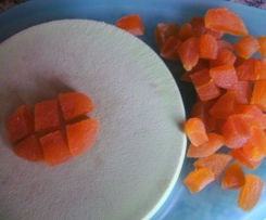 Aprikosen einmal längs und zweimal qwer in Würfel schneiden