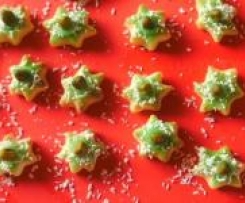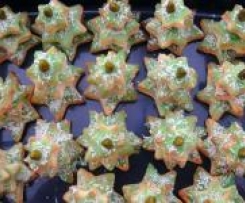 kleine Sterne mit Zuckerguß bestreichen, in der Mitte eine Pistazie "stellen", und mit Kokosraspel betreuen