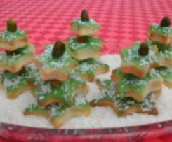 Auch der Versuch, in der Mitte ein "Loch" zu stechen, um sie nach dem Backen mit Holzspießchen zusammenzustecken, ist nicht gelungen, da die "Löcher" sich wieder zusammengezogen haben. So werden manche Bäumchen etwas "windschief" und sehen aus wie "sturmgeprüft" !