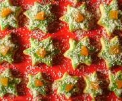 große und mittlere Sterne mit Zuckerguß bestreichen, in der Mitte einen Aprikosenwürfel aufsetzen, und mit Kokosraspel betreuen