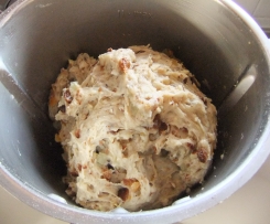 "Mixtopf geschlossen" 3 Min. 70° auf Stufe 2 schmelzen und umfüllen. Milch, Zucker und Hefe in den Mixtopf und 2 Min. bei 37° auf Stufe 2 erwärmen. Dann Mehl, Sultaninen/Rosinen, Zitronat/Orangeat, die zur Seite gestellten Mandeln, den Zitronenschalenabrieb, das Bittermandelaroma und das zur Seite gestellte Fett hinzugeben und 2 Min. 30 Sek. auf Knetstufe vermengen.