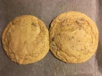 - Mit einem Teigportionierer oder 2 Löffeln Teig abstechen und auf das Backblech geben. 5-6 Haufen reichen, da die Cookies beim Backen sehr auseinander laufen.