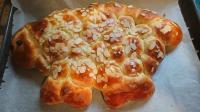 2.Mehl, Eier und Salz zugeben und 3 Minuten Teigknetstufe. Teig in eine geölte Schüssel geben und bis zur doppelten Menge gehen lassen, ca 30-45 Minuten , Backblech mit Backpapier auslegen