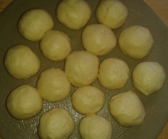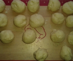 Dann formste 16 gleich große Stücke zu nen Ball, drückst sie mit deinen Handballen etwas flach, machst dann deine gewünschte Füllung rein und verschließt es wieder zu nen Ball.