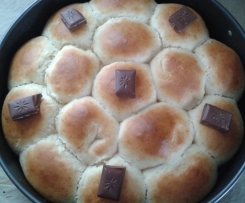 Nu legste einen Schokobrötchen in die Mitte, drum herum kommen die 5 ungefüllten und die restlichen Brötchen aneinander setzen. Lasst ruhig bissl platz zwischen den Brötchen, denn sie gehn noch etwas auf.