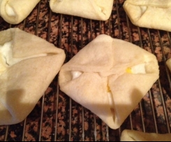 den Teig austreiben auf einer bemehlten Fläche, 6 Quadrate (10x10cm) ausschneiden. Auf jeden Quadrat einen Löffel voll Fülle geben, ein Stück Mango darauflegen, mit den Ecken zusammen falten und leicht drücken, so dass sie nicht werend den backen aufgehen!