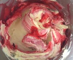 Anschließend die übrige Himbeersoße über den Teig geben und nur ganz leicht mit dem Spatel vermengen, damit der Teig leicht mit der Soße durchzogen ist. So in etwa wie auf dem Foto sollte es aussehen.