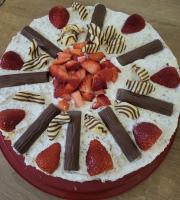 Die Yogurette-Riegel in 3 Teile schneiden und in Sahnehäufchen auf dem Kuchen dekorieren. Fertig