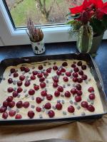 Den Teig auf einem gefetteten Backblech verteilen und mit den abgetropften Kirschen belegen.