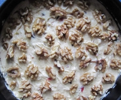 Die Walnüsse auf dem Teig verteilen. Es sieht schöner aus mit kompletten Hälften, besser schneiden lässt sich der Kuchen allerdings, wenn die Hälften noch etwas zerkleinert werden.