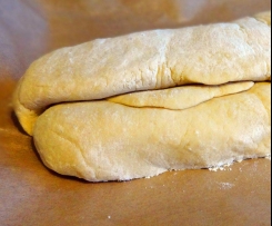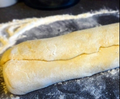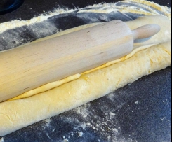 Mit dem Nudelholz der Länge nach mittig eine Vertiefung hineindrücken.