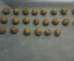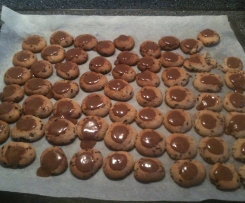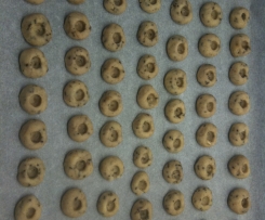 " Modus „Teig kneten“" zu einem Teig kneten, (eventuell Spatel zur Hilfe nehmen) anschließend in Frischhaltefolie einpacken und für 30 Minuten im Kühlschrank kalt stellen, danach Teig zu kleinen Kugeln formen und aufs Backblech auslegen (wirklich klein! Kugeln werden beim Backen noch größer!) Mit dem Stiel eines Kochlöffels Löcher in die Kugeln drücken, bei ca. 175 - 180 C° ca. 15 Minuten backen und anschließend auskühlen lassenDie Nougatfüllung