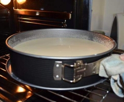 Backform auf Gitter in mittlerer Stufe in den Backofen stellen und die Füllung ( sehr flüßig) in die Springform geben.