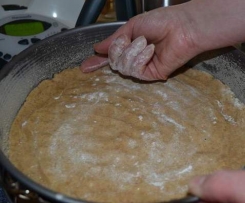 "Mixtopf geschlossen" nehmen und auf einer bemehlten Arbeitsplatte zu einer Kugel formen. Kugel platt drücken und in die Springform legen. Mit gemehlten Händen den Teig etwas am Rand hoch drücken.
