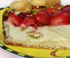 Mit eingestelltem Bild hätte ich ihn mir besser vorstellen können. So muss ich sagen, unter einer Torte verstehe ich etwas anderes. Die Windbeutel sieht man an der Seite leider nicht, alles sieht eher wie ein Käsekuchen aus, nur eben mit Pudding. Da der Rand etwas höher ist, weiß ich auch nicht, wie ich da noch die Erdbeeren drauf kriegen soll. Deshalb werde ich den Kuchen mit Puderzucker bestreuen und dann servieren. Schade, wollte eigentlich was besonderes machen.