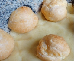 8 Windbeutel zur Seite legen, restliche ruhig auch halbiert auf dem Teig verteilen.